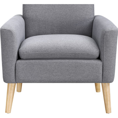 Create an accountThis accent chair elevates your living room with a reading nook. Made in the USA, the frame is made from kiln-dried engineered wood and it sits on light oak-hued flared legs. This chair is wrapped in linen-like polyester in a solid color, with padded round arms and a tight back. Plus, this armchair's foam back and seat cushions are removable, so it's a cinch to vacuum up those inevitable crumbs from toast or snacks while you're reading a new novel.