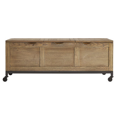 Create an accountThis coffee table has plenty of storage and coastal farmhouse charm, making it an ideal addition to your living room. It's made from solid and engineered wood in a light brown finish with visible wood grain. Recessed panels on all sides add to the farmhouse charm. The tabletop features three lift-top lids that open to individual storage compartments where you can keep blankets, pillows, or board games. Plus, it arrives with a coordinating wooden tray insert that fits snugly inside or allows you to take items with you from room to room. Four wheels let you move this coffee table out of the way for charades.