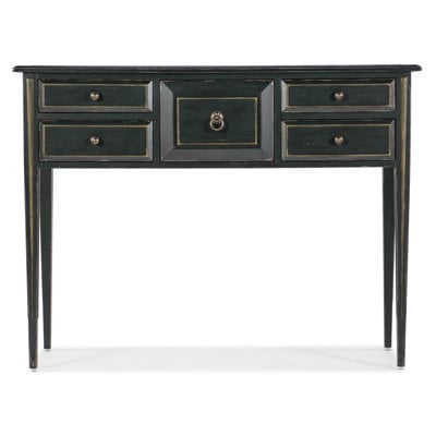 Create an accountThe vintage charm of the coastal South meets the traditional soul of the federal and Georgian design periods with the Charleston console table. Featuring tapered legs and accent highlights, the five self-closing drawers on the chest are finished in a cherry color on the interior. Crafted of maple veneers, the table is finished in Charleston green, a weathered interpretation of the classic dark, almost black, green that adorns trim, shutters, and doors across the historic district of Charleston. The knob and ring pulls are in an antique pewter color.