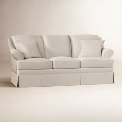 Create an accountThis sofa features a classic silhouette and plenty of cushioning as you relax in your living room after a long day. It has a solid wood frame with four legs that are hidden by a kick-pleat skirt on all four sides. With a variety of hue and upholstery options available, you can easily find just the right one to suit your space. This couch is also filled with foam and sinuous springs to provide ample support as you sit. Plus, two accent pillows are included for another layer of comfort.