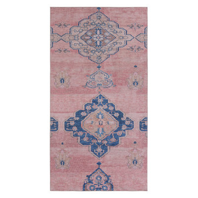 Create an accountThis Oriental rug adds a splash of color and timeless style to any room in your home. It features a medallion pattern in distressed pink, blue, and tan tones for an antique-inspired look that we love. Machine-woven from polyester that's resistant to stains, water, and fading, this indoor rug's low 0.13" pile makes it perfect for high-traffic locations like your living room or entryway. To keep it from slipping and sliding around, we recommend pairing it with a rug pad (sold separately).