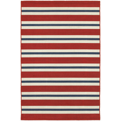Create an accountWith summer rainstorms rolling through, UV rays beating down, and plenty of foot traffic at pool parties and BBQs, your alfresco ensemble's foundation needs to be a polypropylene rug. Take this one, for example: power-loomed from that must-have material and offers a low pile height for easy upkeep. Plus, this stain-resistant rug lends a pop of pattern to your sunny space with a stripe motif in dark red, white, and blue hues.