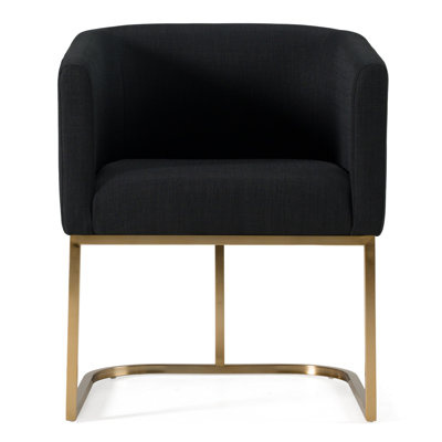 Create an accountThis armchair features clean lines and mixed materials to bring an ultramodern vibe to your dining room or living room. It's supported by an open stainless steel frame with an antique brass finish for a glam touch. Three legs are connected by a sled-inspired base that curves in the back. The seat is wrapped in a black-hued polyester blend fabric and shows off a silhouette that pulls from a wingback design to complete the look. Plus, the cushions provide plenty of padding as you enjoy your favorite beverage.