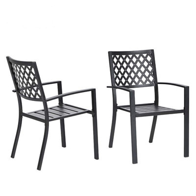 Create an accountThis 2-piece set of patio dining chairs brings a classic, breezy look to your porch or backyard. They're crafted with an iron frame that stands up to the elements, making them a smart choice for outdoor meals or morning coffee. The open, slatted design on the back and seat allows for quick drainage after a rain shower while providing a structured feel. These chairs feature a streamlined silhouette that fits easily around a variety of table styles. Plus, the stackable design makes it simple to store them away during the off-season.