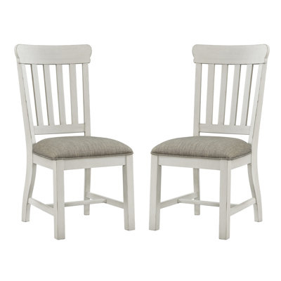 Create an accountThis dining chair features a classic slat-back design that brings an airy, traditional look to your space. It's crafted with a solid and engineered wood frame, showcasing a weathered finish that highlights the visible woodgrain for added depth. The seat is upholstered in polyester, providing a clean-lined surface that complements the structured wooden frame. This piece works well in a space-conscious dining nook or as a standalone accent. Plus, the cushion provides supportive comfort during long family dinners.