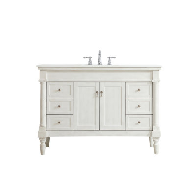 Create an accountThis freestanding single vanity set gives you a spot in your bathroom to prepare for the day or finish your before-bed routine. It has a solid and engineered wood base that rests on traditional tapered legs, while picture frame paneling creates a classic look we love. A central cabinet with double doors along with six functional drawers provide ample space for towels, toiletries, and other bathroom necessities. A natural-cut white marble countertop measures 48" across, and it features an oval porcelain undermount sink (faucet sold separately).