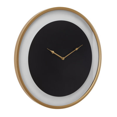 Create an accountThis round wall clock is full of sleek, modern minimalism that fills any room with glam style. It features a metal frame with a brass-finished outer rim and a face that's white on the outside and black in the center. Simple in design, this clock only has two spade hands in the middle and no numerals to be found. With a diameter just under 2', this analog clock runs on a silent quartz movement operating mechanism for precision timekeeping. Plus, it requires a single AA battery to function (sold separately) and can be hung vertically using the keyholes on the back.
