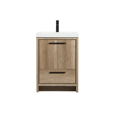 Create an accountThis 24" freestanding single vanity set gives your smaller-sized guest bathroom or powder room a modern vibe with its sleek finish and streamlined bar pulls. Back in multiple neutral-hued finishes to match a variety of color palettes. The resin white countertop includes a rectangular integrated sink faucet sold separately. Underneath the sink are two doors for you to put towels and cleaning supplies. Below the cabinet is a functional drawer with even more storage space. Best of all, this vanity arrives fully assembled.