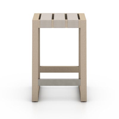 Create an accountPull up a stool and stay awhile. FSC-certified teak forms an airy, angular frame, with kick plates for comfort plus strap seat detailing for textural intrigue. Cover or store indoors during inclement weather and when not in use.